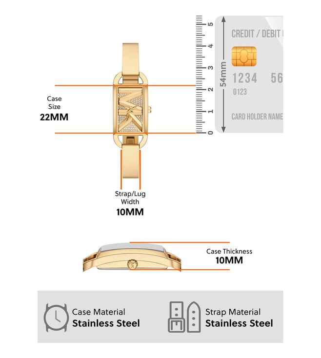 Michael Kors' 22mm MK Empire watch features a gold pav¿ dial, three-hand movement and gold-tone stainless steel bangle bracelet. Amaze everyone around you by wearing this women's analog watch from the collection by Michael Kors. The gold rectangular dial is protected by a mineral glass. It features a crown for time adjustment.