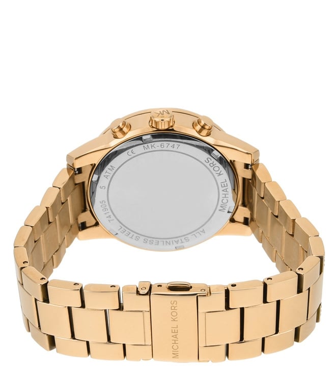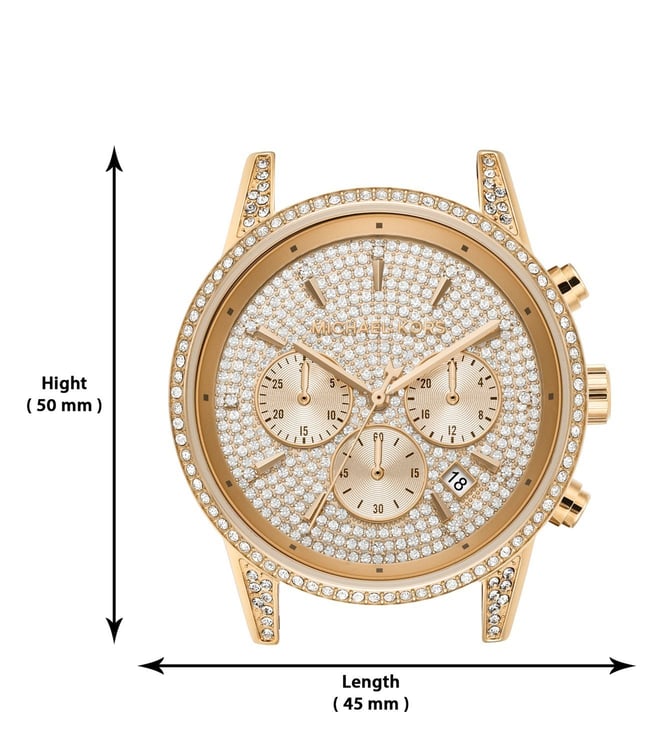 This Ritz chronograph watch will bombard you with compliments all day long. This is one watch which will make sure you look at it more than once. Cast in luxe-tone stainless steel, this classic design dazzles with allover pave crystals and features a detailed display. This MICHAEL Michael Kors women's watch is features a sleek dial and bracelet. This quartz watch is equipped with multi-dial working and has a case thickness of 12 mm and inner circumference of 190+/- 5 mm.