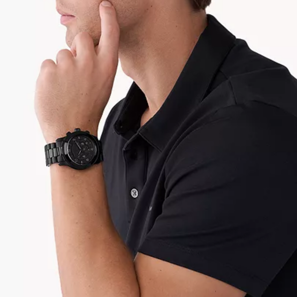 The Iconic Runway makes its return in this Men's black stainless steel watch. Sporty and bold, this oversized 45mm watch is a true statement piece. Featuring a chronograph movement with bold numerals on the dial, this watch was designed with the jet-set lifestyle in mind.