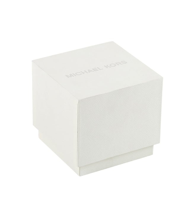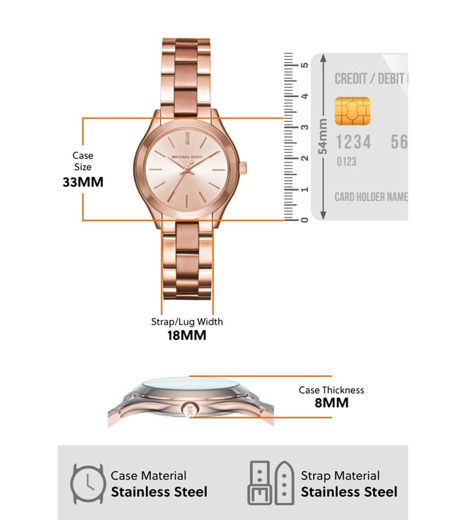 Watch Sizing Guide Elevate your look with this stunning luxe Michael Kors® watch. Stainless steel case. Stainless steel bracelet with fold-over, double push-button release. Round face. Three-hand analog display with quartz movement. Dial includes brand name logo and hour markers. Polished top ring. Water resistant up to 5 ATM. Display case included. Imported. Measurements: Case Height: 34 mm Case Width: 34 mm Case Depth: 8 mm Band Width: 15 3⁄4 mm Band Circumference/Length: 8 1⁄4 in Weight: