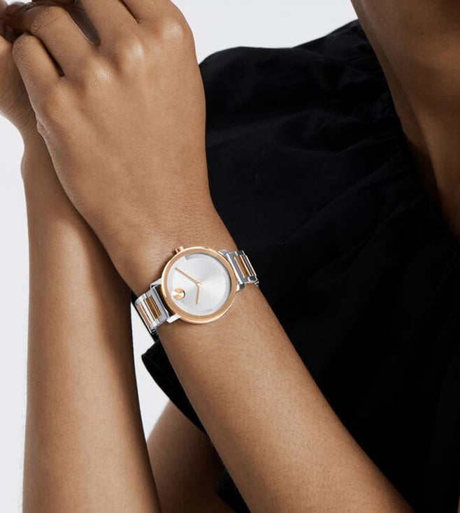 Add a stylish dimension to your look by wearing this women's analog watch from the collection by Movado. The silver round dial is protected by a mineral glass. It features and a crown for time adjustment. The stainless steel strap comes in a two tone hue that further elevates the look of the timekeeper. Besides, it is completed with a deployment clasp with push button clasp to ensure a secure fit on the wrist.