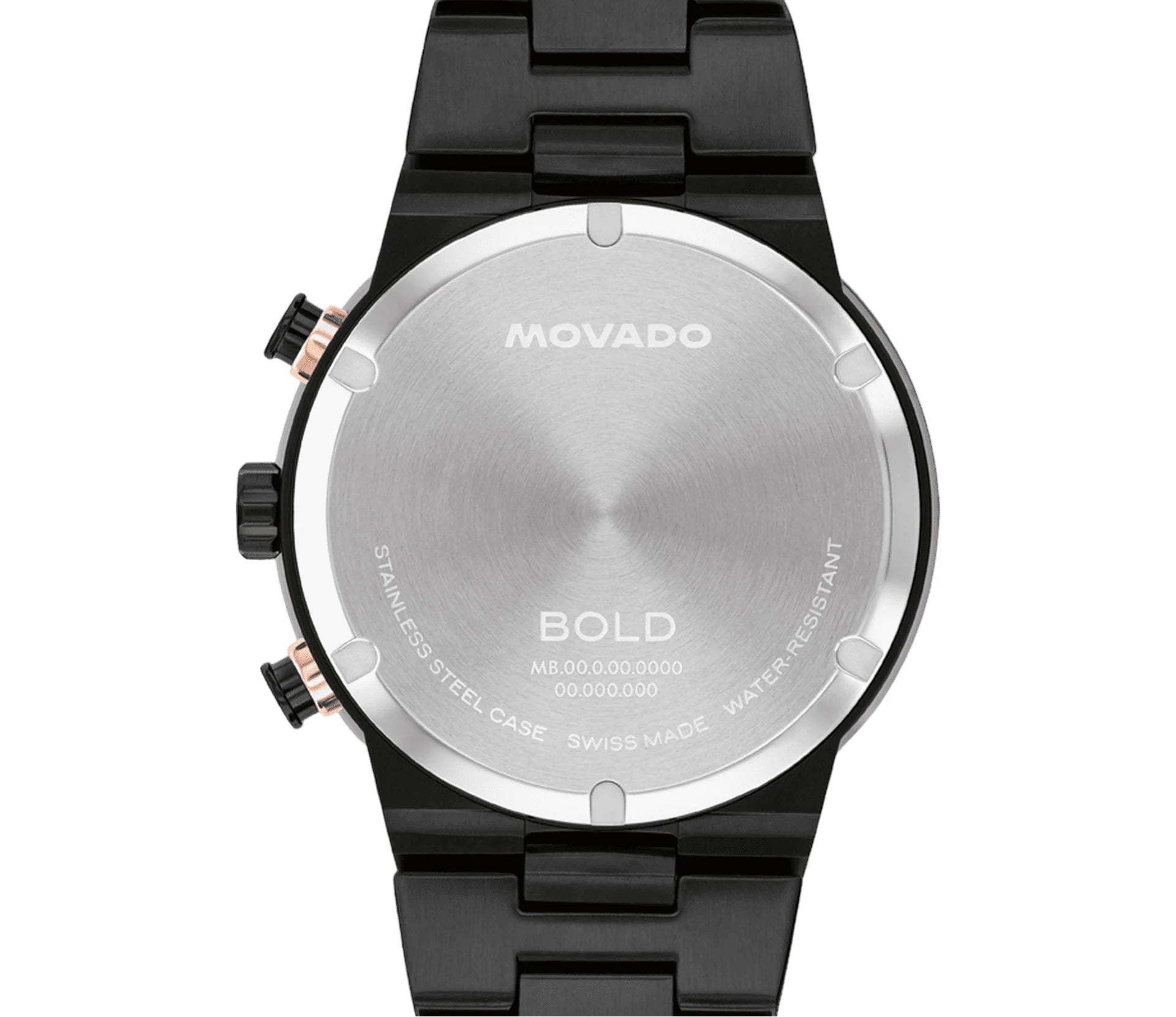 The Movado Bold Fusion Chronograph 3601282 combines a bold, sporty case with a retro-futurist design aesthetic. This 44.5 mm chronograph showcases a sleek black dial accented with rose gold-tone subdials and Swiss Super-LumiNova® detailing for enhanced visibility. Crafted from black ionic plated stainless steel, it features a matching link bracelet for a powerful and cohesive look.