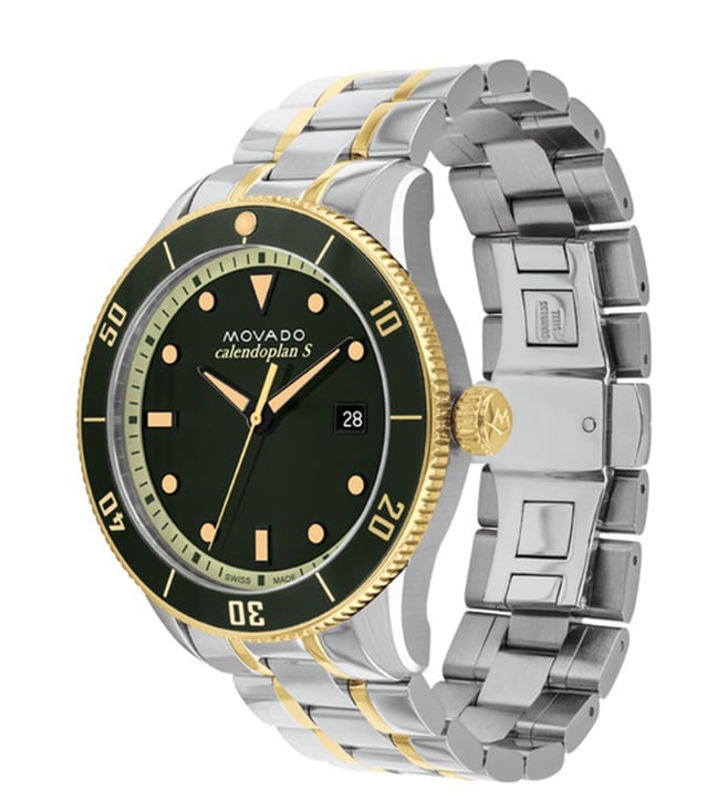 Movado Heritage Quartz watch, sporting a sturdy stainless steel case juxtaposed with a magnificently crafted two-tone stainless steel bracelet. The harmony of silver-tone and yellow gold-tone makes for an elegant timepiece suited for any occasion. The functionality of this Swiss made keepsake is equally impressive. The stylish dial with black hands and index hour markers glow in the dark, thanks to their luminescent detailing. The state-of-the-art quartz movement, enclosed within a scratch resistant sapphire crystal, makes precise time keeping reliable.