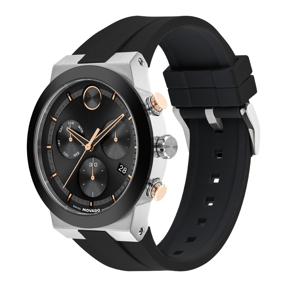 This 44mm chronograph watch features a black sunray dial, ceramic bezel, and a black silicone strap.