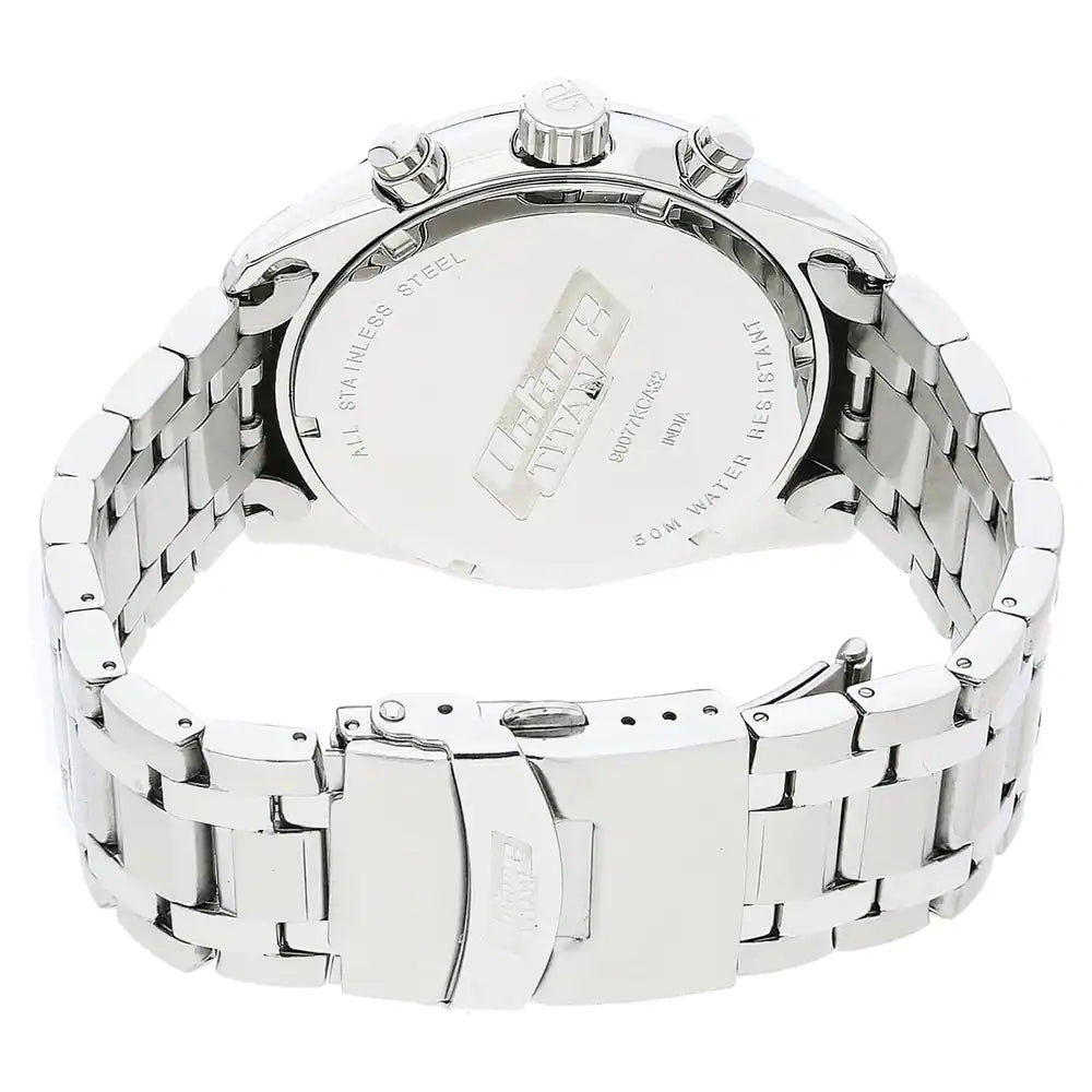 This chronograph watch for men contains a blue, round dial encased in a stainless steel case. The dial has plain three hands and three subdials. A date aperture is present at the fourth hour interval. The bezel contains Arabic numeral markings and stick indicators. Its strap is black in colour, made of stainless steel and comes with a push button clasp with a safety latch . A crown and pusher are present. Equipped with 5 ATM water-resistant depth, this watch is user-friendly. It comes with a 24 month warranty.