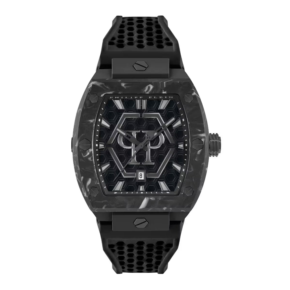 A classy look in a contemporary frame is what perfectly defines this men's analog watch from the Pua-The Hexagon Phantom collection by PHILIPP PLEIN. Its silicon strap exudes a black hue that elevates the look of the watch. Housed in a 44 mm case, the black tonneau dial is protected by a mineral glass. It showcases plain three hands. Furthermore, it is complemented with a buckle clasp that ensures a secure fit on the wrist.
