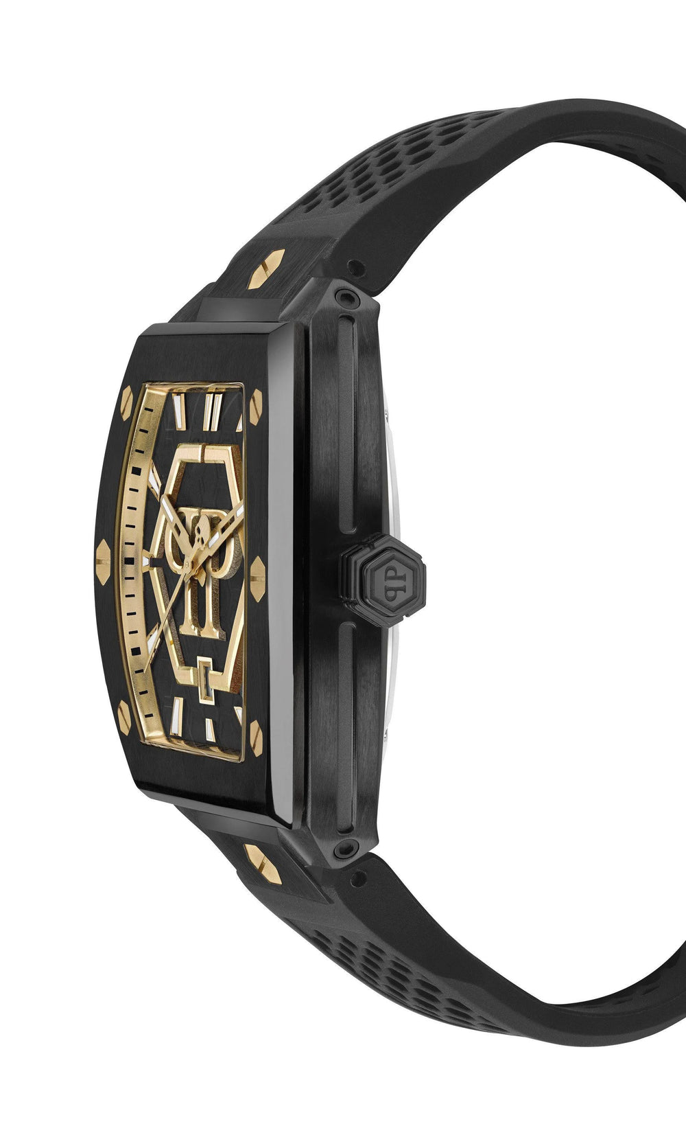 Get hold of this stylish men's analog watch from the Pua-The Hexagon Phantom-P collection by PHILIPP PLEIN and enhance your casual timepiece collection. The silicon strap showcases a black hue that uplifts the look of the watch. Functional on a quartz movement and protected by a mineral glass, the black tonneau dial housed in a 44 mm case. It displays plain three hands. Besides, it is completed with a buckle clasp to ensure a secure fit on the wrist.