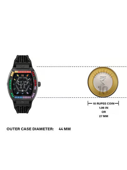 Seamlessly fusing fashion and utility, this men's analog watch from the Pua-The Hexagon Phantom-P collection by PHILIPP PLEIN is sure to make a style statement. Operated by a quartz movement and safeguarded by a mineral glass, the black tonneau dial is encased in a 44 mm case. It features plain three hands. The silicon strap flaunts a black hue that accentuates the look of the watch. Moreover, it is fitted with a buckle clasp that ensures a secure fit on the wrist.