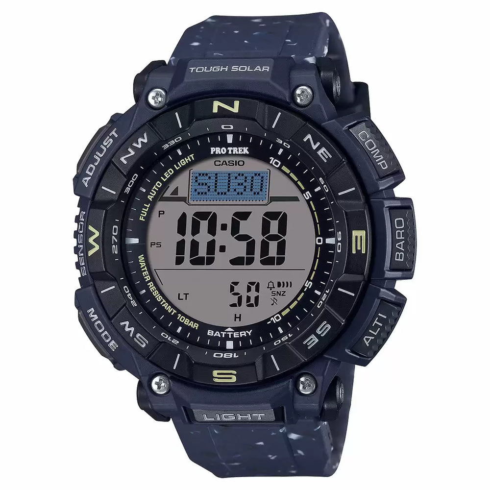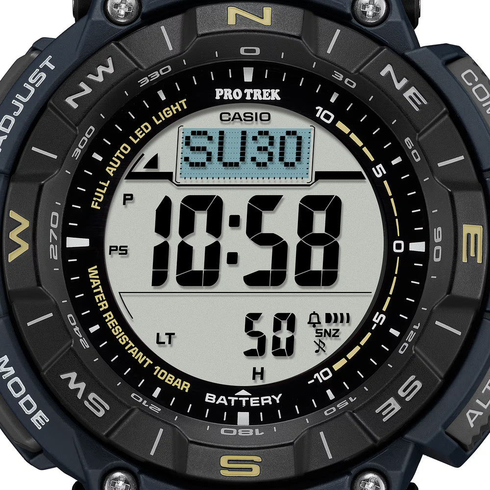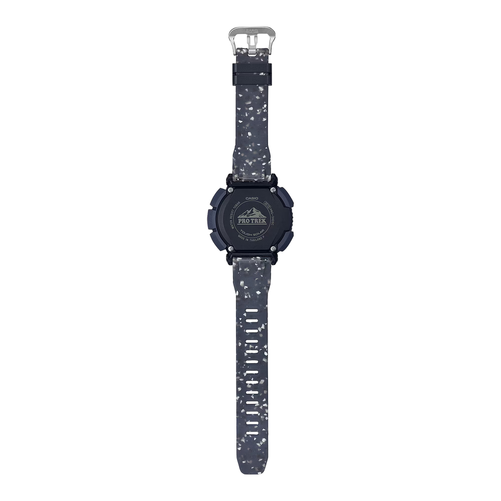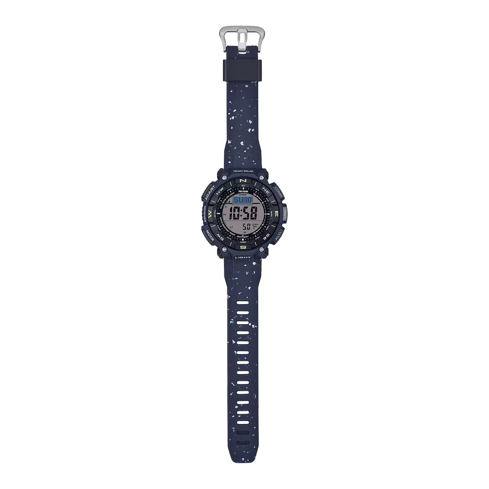 Go bold and bright. Get out and explore the great outdoors! Get the PRO TREK PRG-340SC with dual-layer LCD, featuring environmentally responsible materials. This is the first PRO TREK timepiece with a Dura Soft band made from reused resin scraps left over from manufacturing processes. In keeping with the PRO TREK commitment to reducing environmental impact by using sustainable materials, reused resin scraps are an excellent complement to a line of watches. Taking its cue from the PRG-340, key components for the case, rotating bezel, and case back are made with bio-based resin. Produced using renewable organic resources, this material is another way to help reduce environmental impact. Not just nature loving, but practical, too. The Triple Sensor delivers compass bearing, barometric pressure, temperature, and altitude readings. The dual-layer LCD ensures outstanding visibility of compass graphics shown on the top layer and various measurements on the large display on the bottom layer. *Due to the special material used , the textured pattern on the surface of the band is uneven.