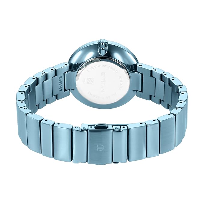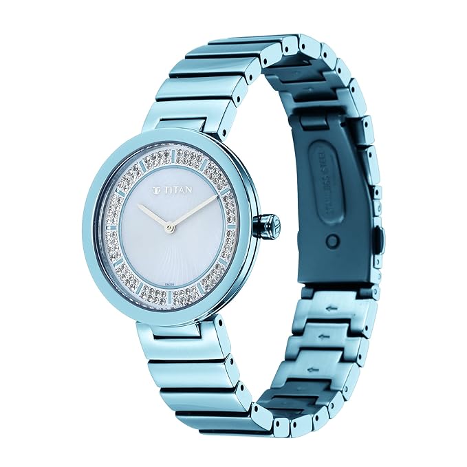 The blue round dial is encased in a 34 mm case. It exudes plain two hands and a crown for time adjustment. The stainless steel strap exudes a blue hue that accentuates the look of the watch.Merging contemporary style with performance, this women's analog watch from the Purple Unending Beauty collection by Titan will lend you a modish look.