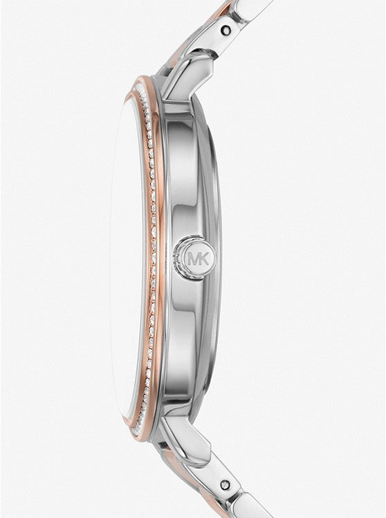 Pyper Two-Tone Embossed Logo Watch MK4667 Our Pyper watch is the definition of everyday elegance. Designed with a classic two-tone strap, this timepiece features a sparkling pavé topring and sleek dial that boasts embossed “MK” lettering. Wear it solo or stack it with gleaming bangles for a glamorous effect.