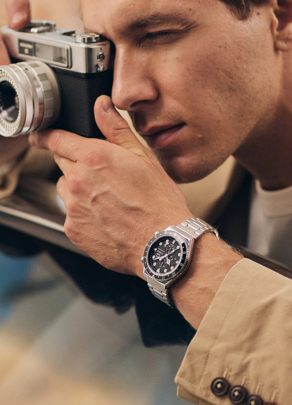 A watch for those thrilled by the open road ahead, our Q Timex 3 Time Zone Chronograph pairs the spirit of adventure with unmatched quartz precision. It's equipped with an hour hand and red second hour hand which can be set independently to track two different time zones, a rotating top ring which can accommodate a thirdtime zone using either of the hour hands, and a standard chronograph function. Itrecalls the design aesthetics of our original dive-inspired Q, but sleek updates breathe new life into its familiar 40mm case profile: a modernized Q Timex logo, flat mineral glass crystal withbeveled edge, stainless-steel crown with rubber accent, and a 24-hourformat sub-dial at the 12 o'clock position of its black, white, or forest green dial.Slip on the stainless-steel bracelet or interchangeable black synthetic rubber strap,get your playlist ready, and pack lightnow is the time to travelin style.