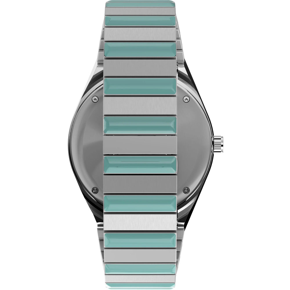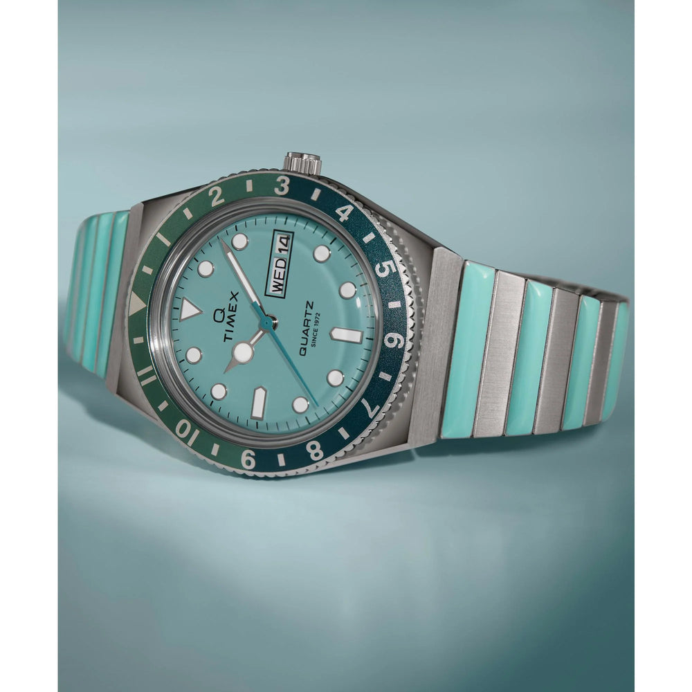 This fresh update to our Women's Q Timex offers a soft pastel colorway, with the dial, bezel, and brushed stainless-steel Perfect Fit expansion band featuring sweet shades of aquamarine. Other details include all you’d expect from our Q – a bidirectional rotating top ring, day of the week and date window, bold hour markers, and domed acrylic crystal.