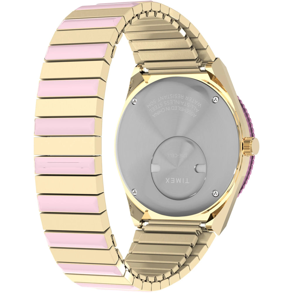 This fresh update to our Women’s Q Timex features a soft pastel colorway, with the dial, bezel, and brushed gold-tone stainless-steel Perfect Fit expansion band featuring sweet shades of pink. Other details include all you’d expect from our Q – a bidirectional rotating top ring, day of the week and date window, bold hour markers, and domed acrylic crystal.