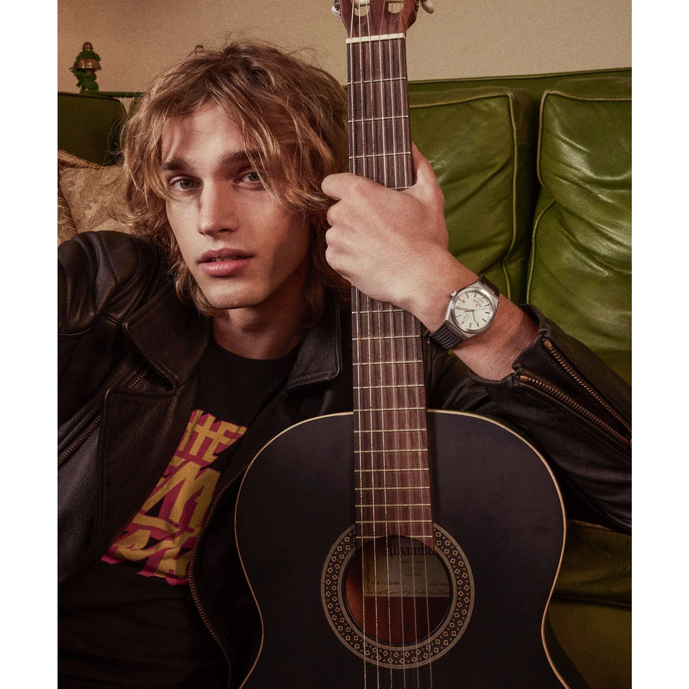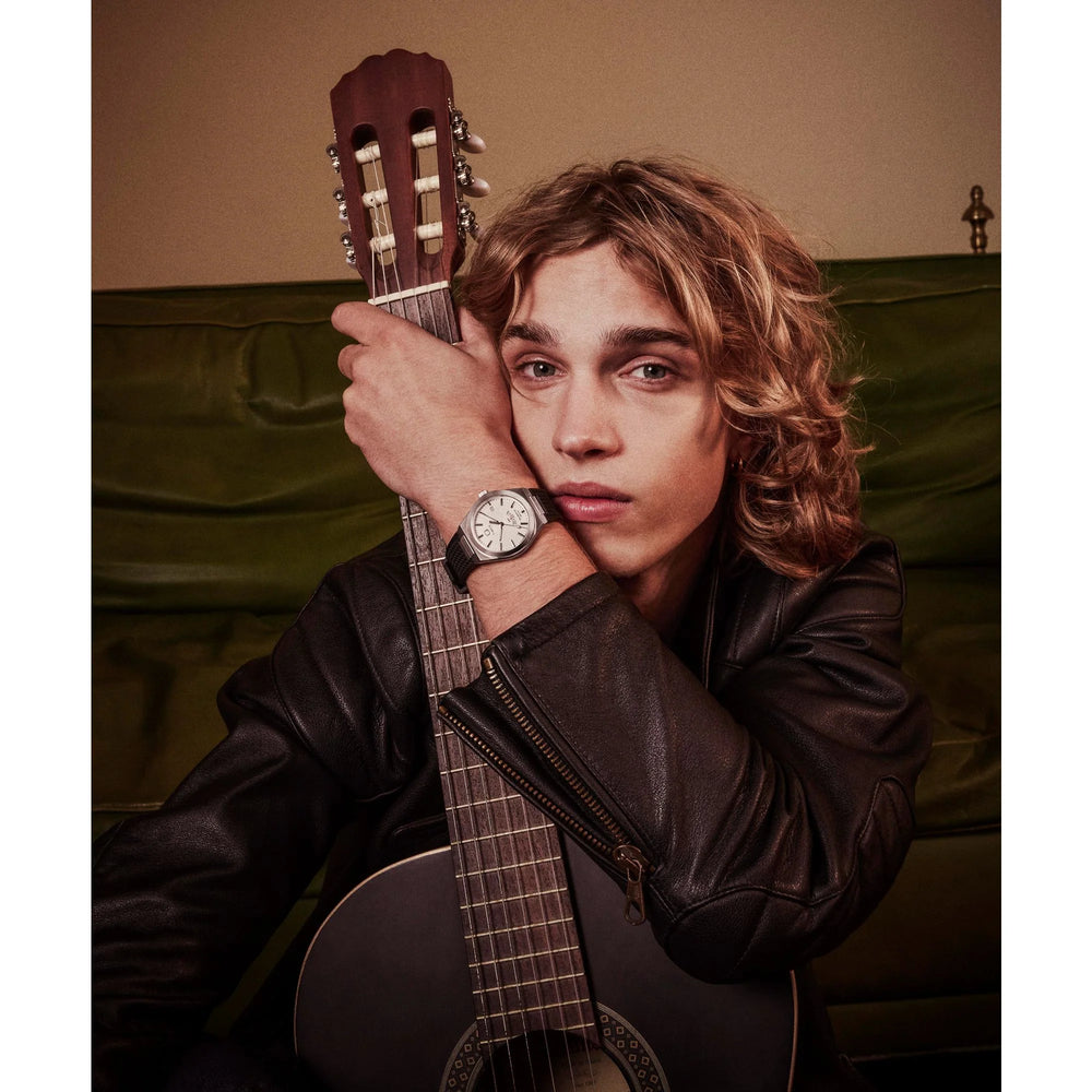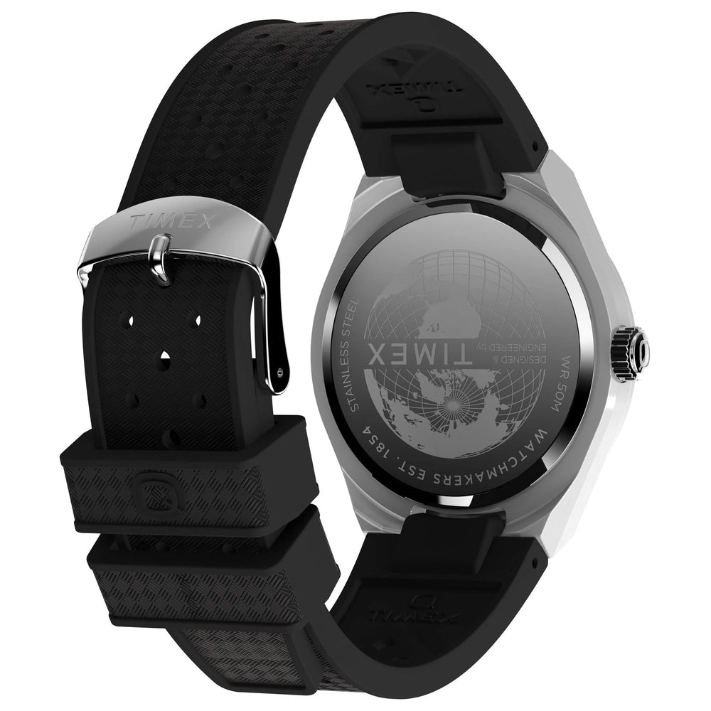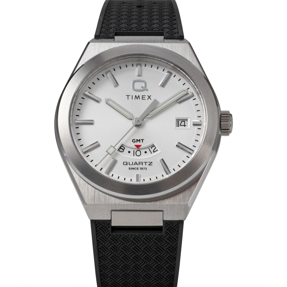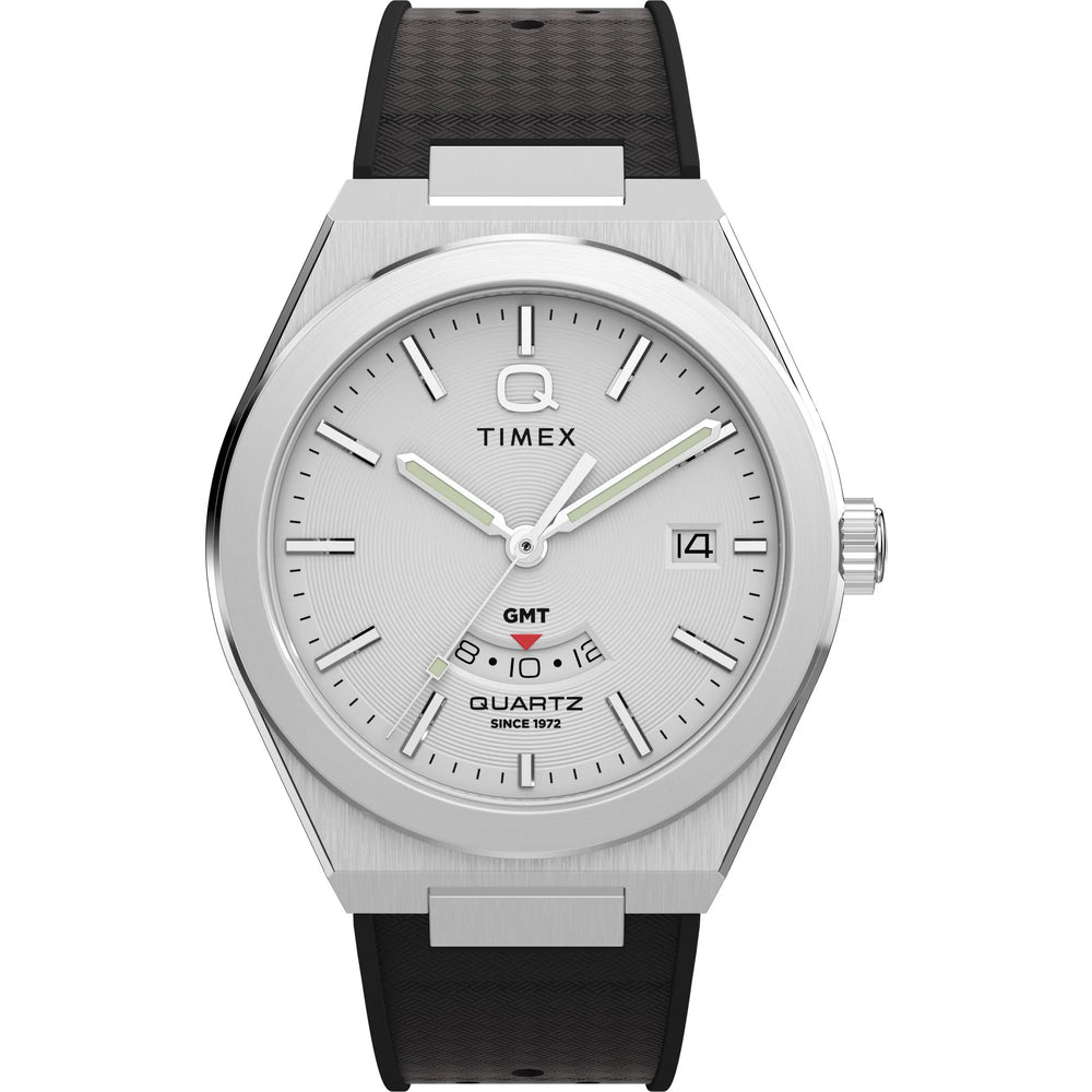 Channeling the bold designs and decadent glamour that filled the scene in ‘70s West Hollywood, the Q Timex® Continental GMT brings refinement to our beloved Q Timex collection with a new streamlined 39mm brushed stainless-steel case with polished edges and a sleek GMT function featuring a discreet display at 6 o’clock. The simple black or silver-tone dial features a radial texture and a clean presentation that’s effortlessly cool, highlighted by faceted hour markers, luminant hands for enhanced visibility in the dark, and a glanceable date window beside the 3rd hour marker. The textured black synthetic rubber strap that’s perforated makes for a more laid-back look as you let the hours slip away.