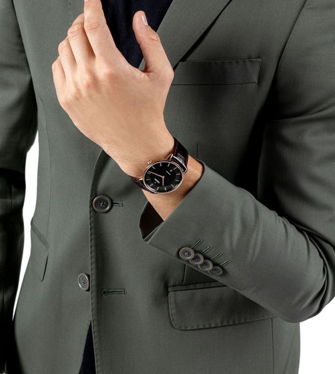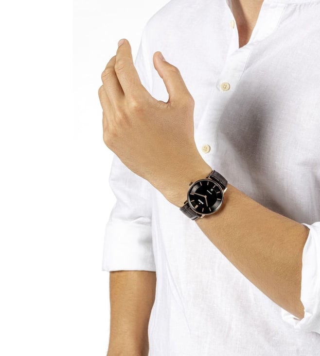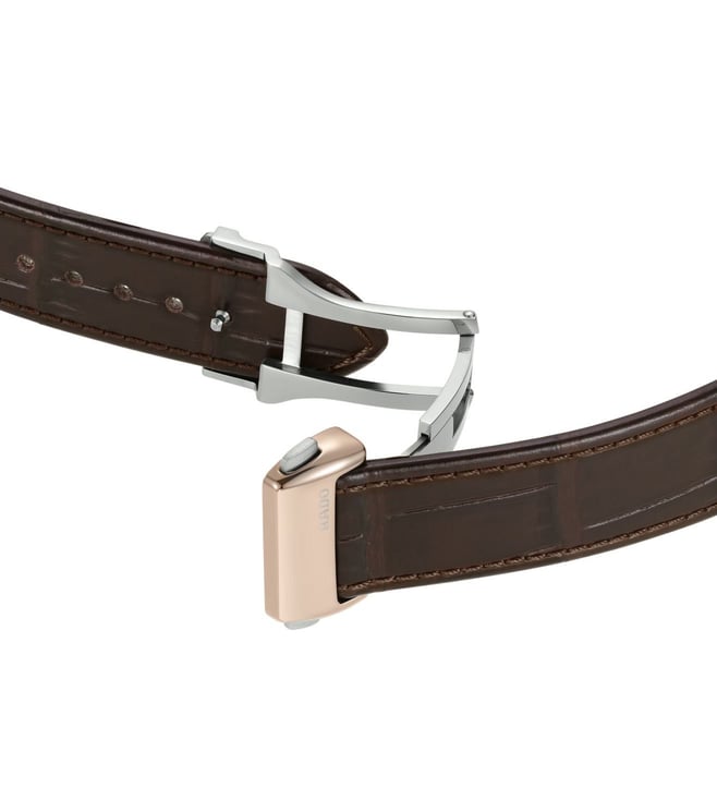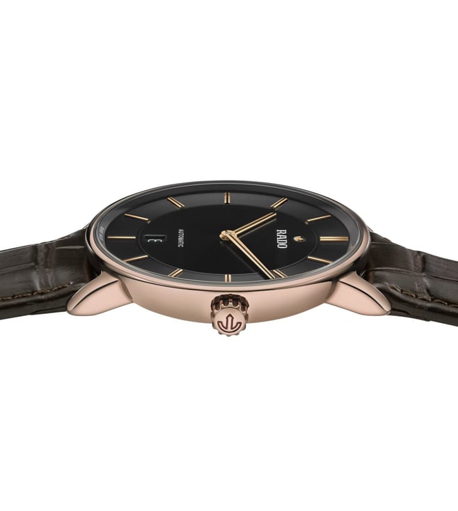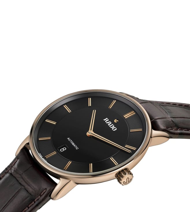 Powered by the automatic Rado caliber R766 movement, this watch seamlessly combines tradition and innovation. With an impressive 72-hour power reserve this watch ensures long duration. Housed in a 41 mm polished rose gold colored Ceramos case, the dial is accentuated by rose gold colored applied indexes with a black veneer, showcasing a captivating interplay of light and shadows. The rose gold-colored hands, also adorned with a black veneer, provide excellent legibility. It is complemented by a stylish leather strap featuring a buckle cover in Ceramos that exudes both refinement and comfort.