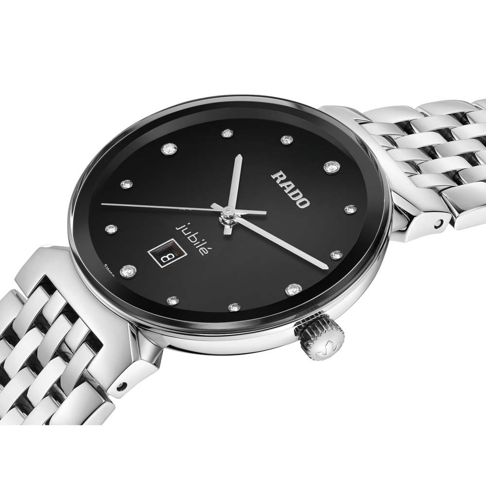 The harmonious design of the Rado Florence Classic watch is inspired by the elegant domes and towers of the city from which the collection takes its name. The 30 mm watch has an edge-to-edge-beveled, curved sapphire crystal. The stylish bracelet is made of polished stainless steel, completing the overall appearance of this iconic timepiece. The sunray dial with twelve diamonds is emphasized with the printed jubile logo, which matches perfectly with the rhodium-colored hands. Powered by three-hand caliber quartz movement, the watch has 50 m water resistance and resistance to shocks.