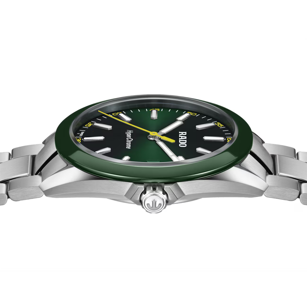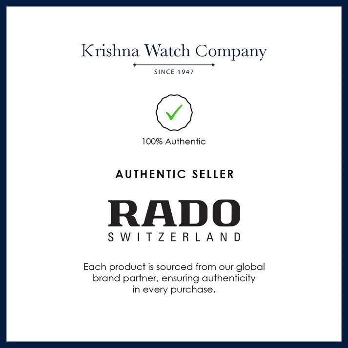 Designed for lasting durability and confidence, this timepiece is water-resistant up to 15 bar (150 metres). At its heart, the Rado calibre R292 quartz movement ensures exceptional performance. This 3-jewel caliber integrates PreciDrive and HeavyDrive technologies for accurate impulse regulation and maintains a deviation of no more than ±10 seconds per year. A date window at 3 o’clock merges seamlessly into the overall dial symmetry.