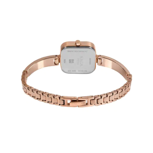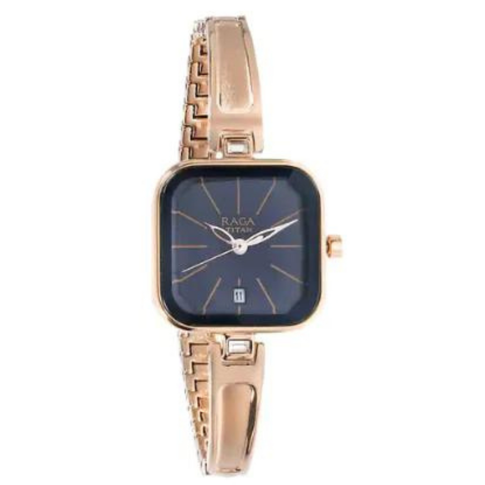 Time to wear the blue hue! Titan Raga Viva collection features this classy and royal timepiece having bright blue analog dial paired magnificently with rose gold metallic strap. As rich as it looks, the watch shows the time with better readability using 12 metal applique indices placed at five-minute intervals and three plain hands, including an additional seconds hand for precision time viewing. The sunray finish dial of the watch has metallization on mineral glass for premium look while the watch has multifaceted mineral glass for enhanced aesthetics by play of light. Crafted brilliantly, the dial of the watch has date function for everyday use and the strap of the watch has dual finish, gloss and matt, serving as an elegant bracelet with jewellary clasp for the perfect fit. Just when you think it cannot get better, it does. This timeless timepiece has Baguette Crystals at the strap and dial junctions, like the dazzling jewels in the royal crown. Fabulous and functional, the watch is water resistant and scratchproof, making it your ideal superb pick
