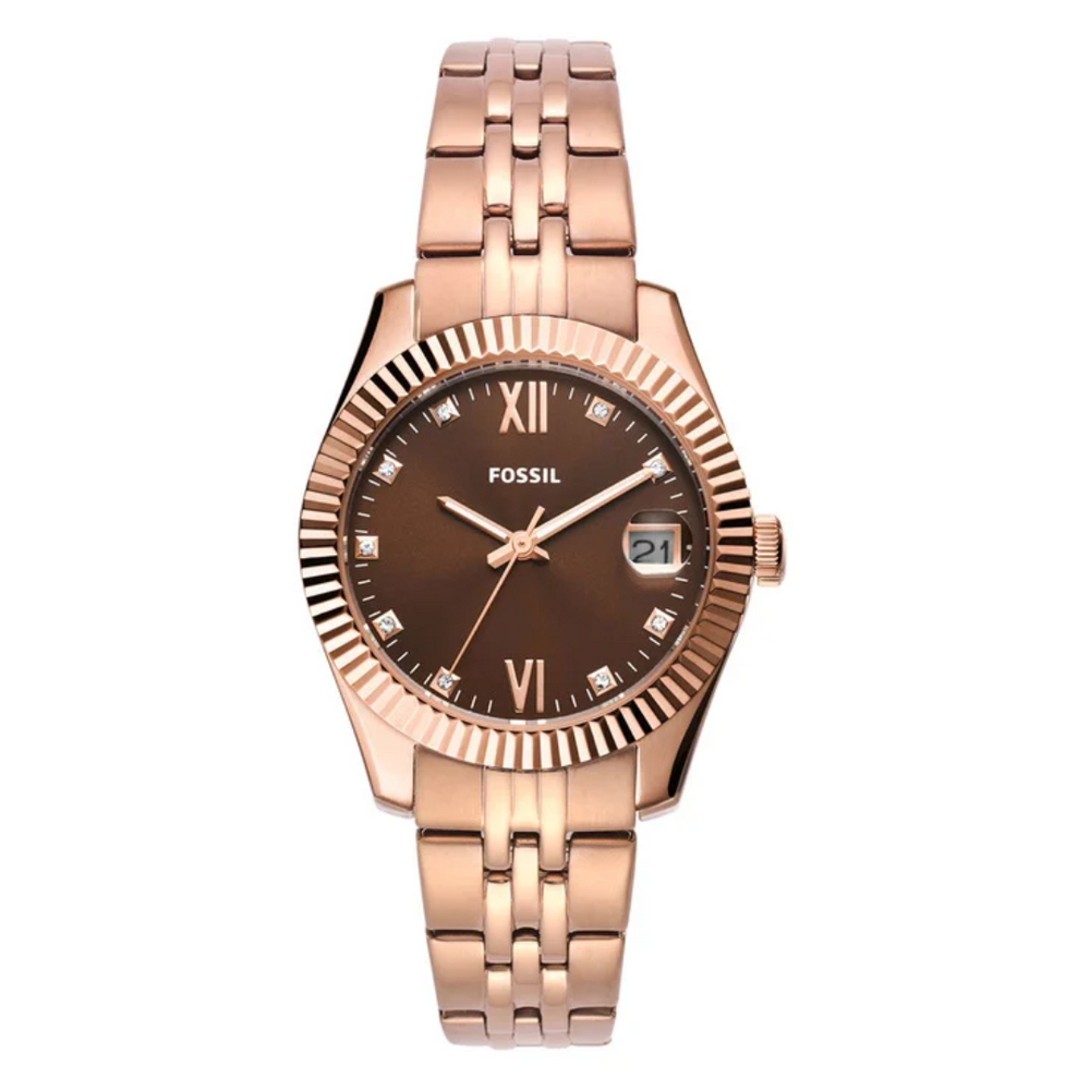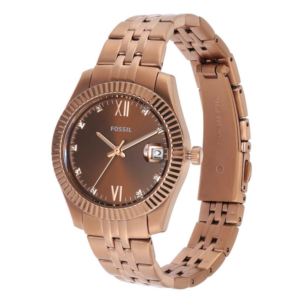 Sport-inspired Scarlette is designed for the stylish go-getter. With a brown sunray dial and this new rose-tone stainless steel bracelet and fluted topring, it has a refined look that¿s suited for seizing any moment. A precision Japanese three-hand movement with date window provides the perfect amount of function.