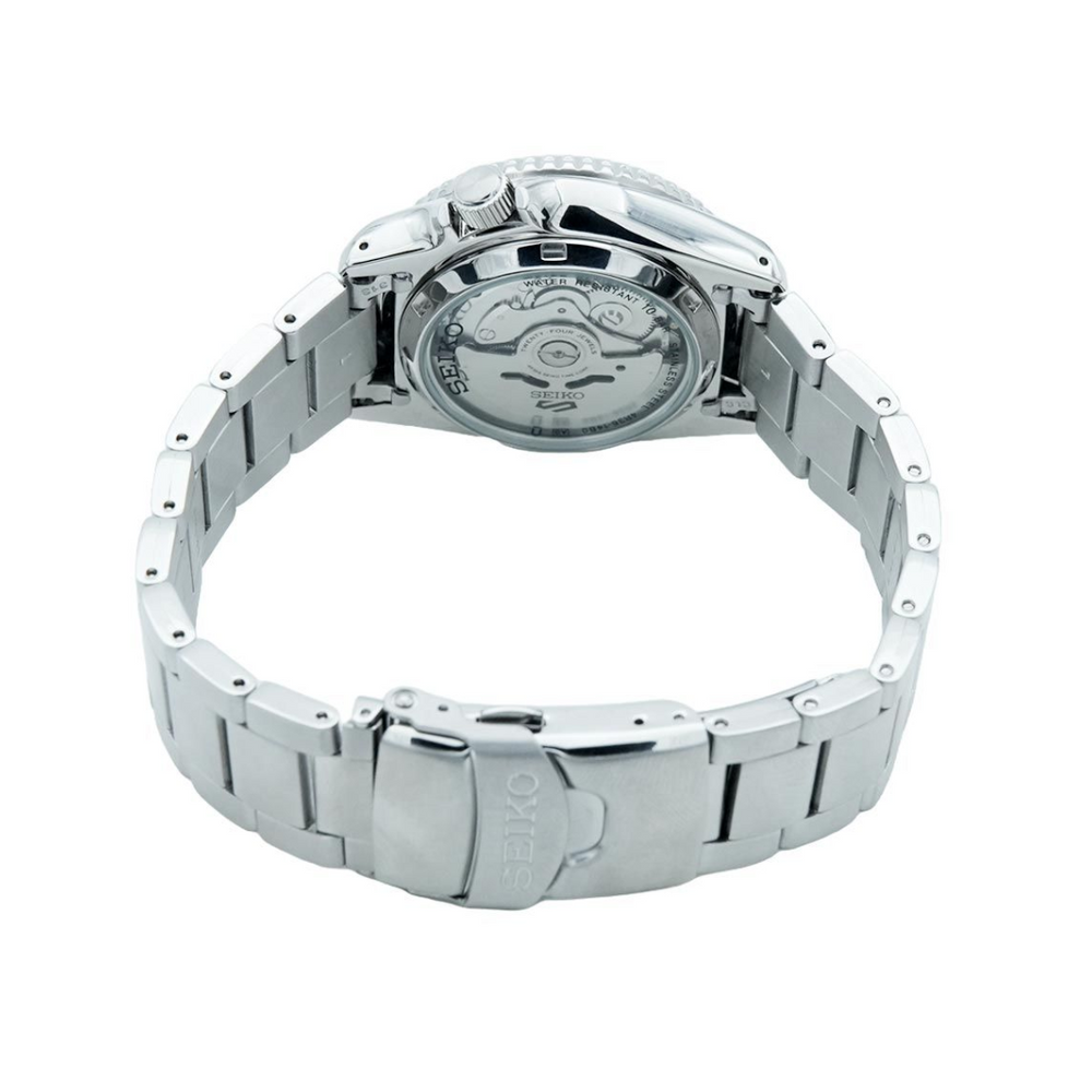 The Seiko 5 Sports collection watch comes with automatic movement. Hardlex black dial with a 42.5 mm stainless steel case is attached to a stainless steel bracelet. Along with day and date features and water resistance of up to 100 m, the watch comes with two years warranty period.