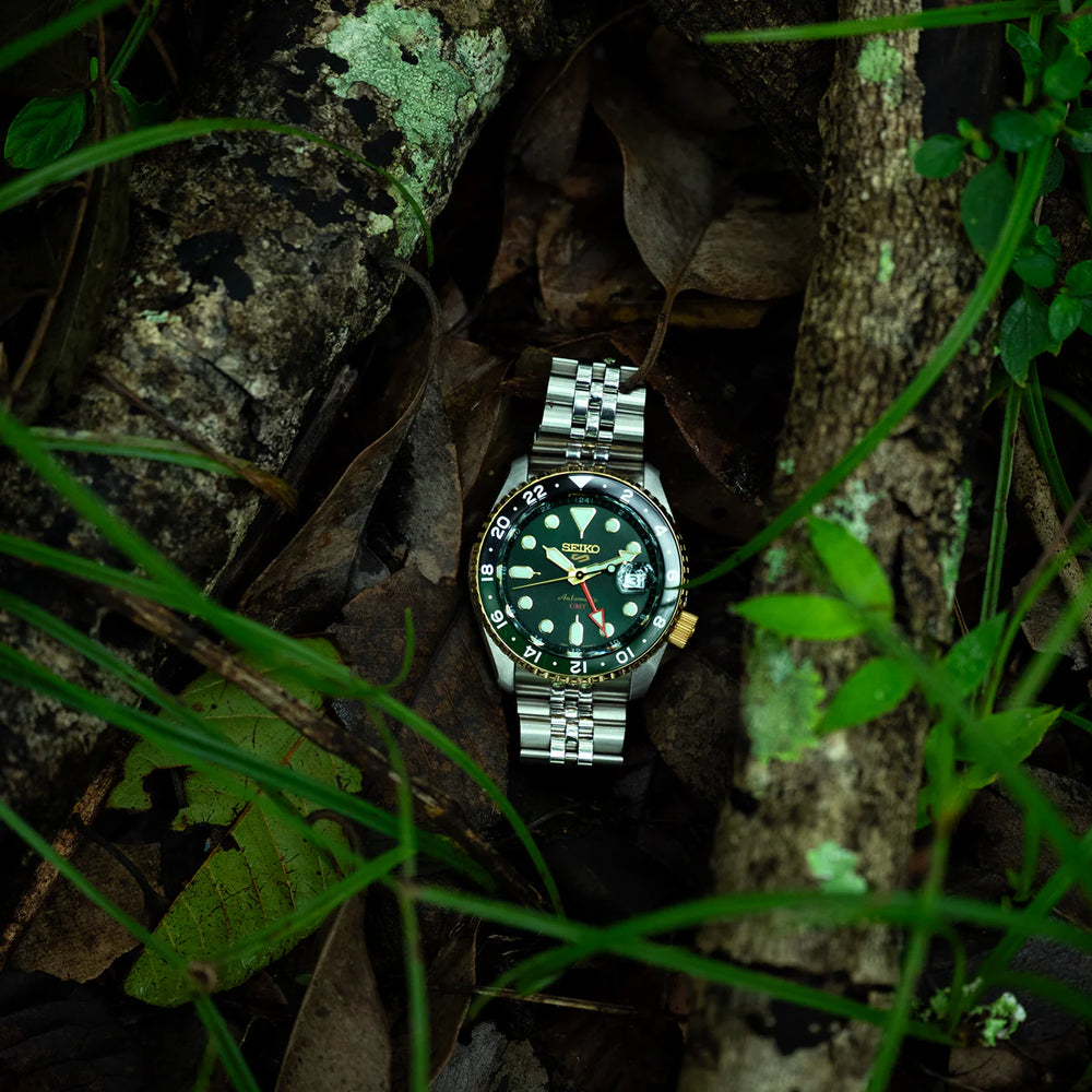 The Seiko 5 Sports Forest Green Sunrise celebrates the beauty of India’s wilderness and the first light of dawn. Its deep green dial mirrors the heart of the forest, rich with mystery, while golden accents on the bezel capture the glow of sunrise breaking through the canopy.Powered by the Calibre 4R34 automatic movement, the Forest Green Sunrise features a GMT function that tracks time across zones with ease. A cyclops lens above the date enhances legibility, while the stainless-steel case delivers enduring strength. With 100-metre water resistance, it is ready for sudden rains and untrodden paths.