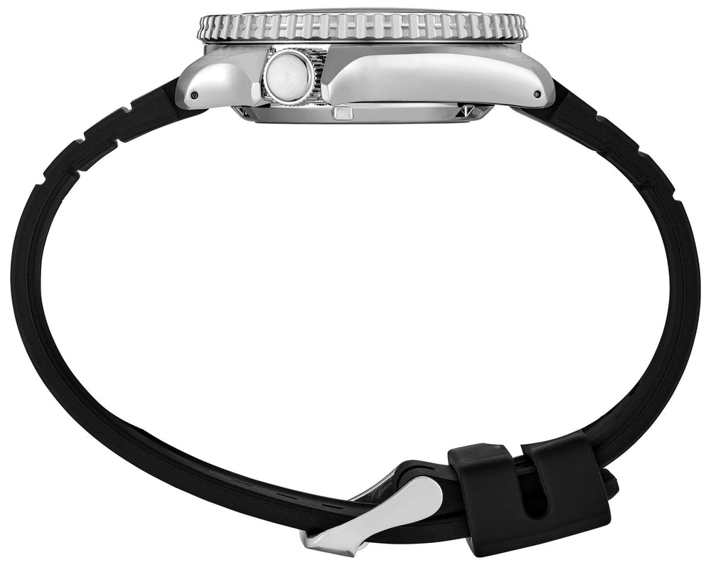 This modern yellow dial model inherits the layout of the original piece, taking the same richly textured indices and hands, but with updated finishing on the knurling of the bezel and a glossy glass bezel insert for increased sparkle. This piece is paired with black silicone strap for style and comfort.