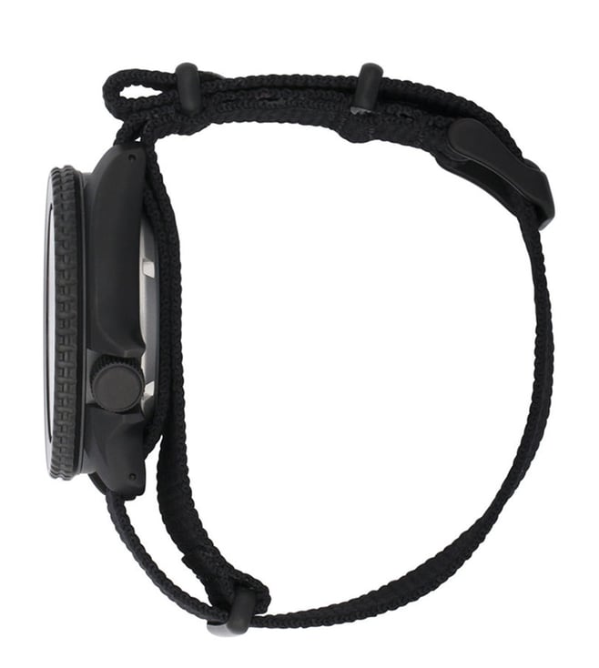 The Seiko 5 Sports collection watch comes with automatic movement. Hardlex black dial with a 42.5 mm stainless steel case is attached to a nylon strap. Along with day and date features and water resistance of up to 100 m, the watch comes with two years warranty period.