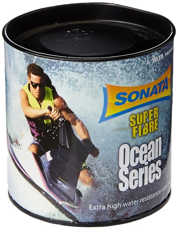 This digital watch for men features a grey, square dial, housed within a black, plastic case. Four push buttons on the case allow time adjustment. Made of plastic, the strap is red-coloured, and it is secured by an adjustable buckle closure. A 3 ATM water resistant depth makes this timepiece user-friendly.