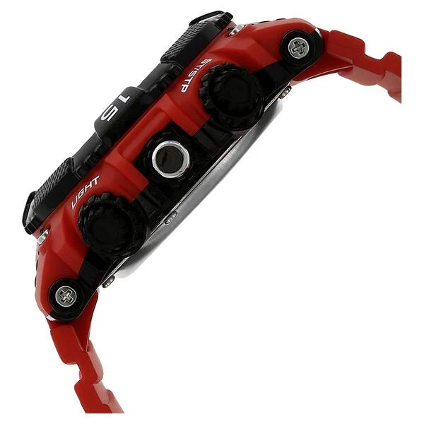 This analog-digital for men has a black round dial, housed within a plastic case. The chronograph-featured dial shows the day, date and seconds. The dial also displays the time digitally. Four push buttons and a crown let you adjust the settings. The seconds values are displayed on the case at quarter intervals. Plain three hands on the dial ensure easy time reading. Its red strap is secured by buckle closure. Featuring a dual time and EL backlight, this watch is equipped with a 10 ATM water resistant feature and comes with a 12 month warranty.