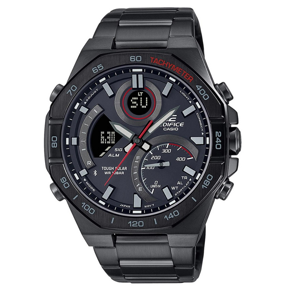 Get smartphone connectivity and so much more in an analog-digital combination EDIFICE timepiece, made to project speed and intelligence. The bold, sophisticated design features an octagonal bezel that evokes the lines of a race car mechanic’s tools. More than just an eye catcher, this watch delivers full-on functionality so you can get all the information you need on the easy-read hands and LCD. Sync with your smartphone via Bluetooth® for precision timekeeping, wherever you go. Simply tap on the app to effortlessly manage functions like selecting a city from the World Time list. The large inset dial at the 4 o’clock position boasts a speed indicator that displays average speeds when timing laps for set distances. The fully automatic LED light illuminates the dial and LCD with just a tilt of the wrist. Tough Solar charges the watch from sunlight or even fluorescent lamp light.