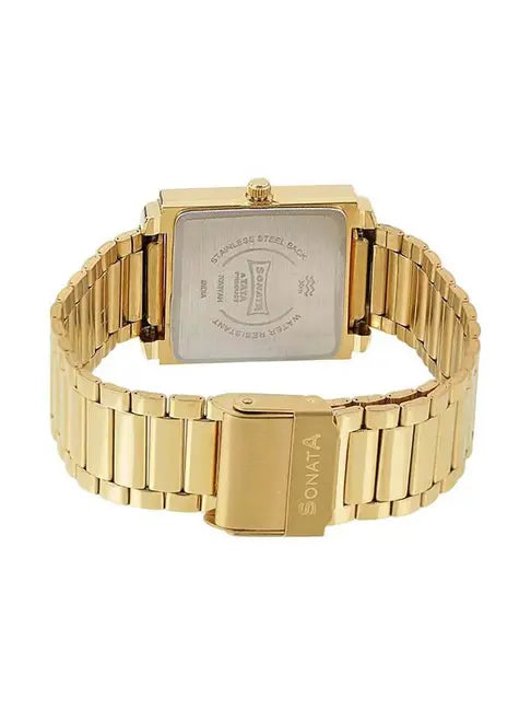 A perfect pick for every watch lover, this men's analog watch from Sonata blends functionality with modern day style. Secured by an acrylic glass, the champagne gold rectangular dial encased in a 27.4mm case features plain three hands, stick markings at the five-minute intervals and a crown for time adjustment. Its golden metal strap is equipped with a hook buckle clasp to ensure a secure fit on the wrist. Club this water-resistant timepiece with a white shirt to look modish.