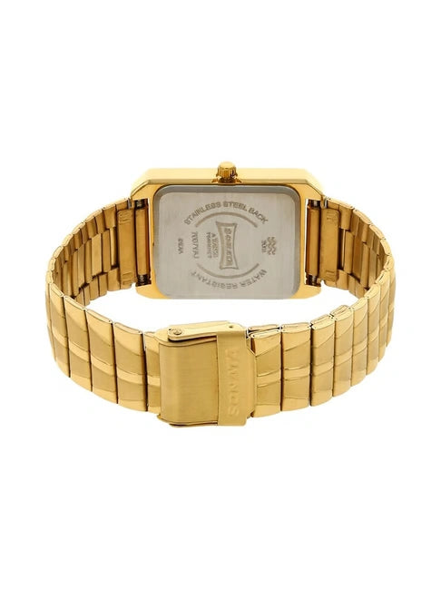 Showcasing a contemporary style, this men's analog watch from Sonata is a must-have timepiece. Enclosed in a 35.4 mm case, the golden rectangular dial looks quite attractive. It displays plain three hands and a crown for time adjustment. The stainless steel bracelet comes in a golden hue that further elevates the look of the timepiece. Furthermore, it is completed with a hook buckle clasp to ensure a secure fit on the wrist. This water-resistant watch will be your timeless possession.