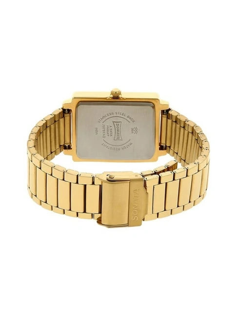 Style arrives effortlessly the moment you wear this smartly designed men's analog watch from Sonata. Encompassed in a 40mm case, the white rectangular dial features a crown for time adjustment, plain three hands and slanted marking at five-minute intervals. The golden stainless steel strap is equipped with a hook buckle clasp to ensure a proper fit on the wrist. Wear this water-resistant timekeeper with a pair of trousers and a white shirt to look dapper.