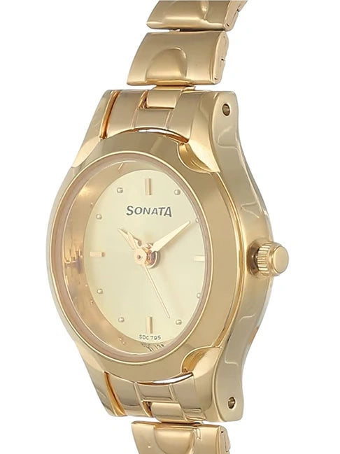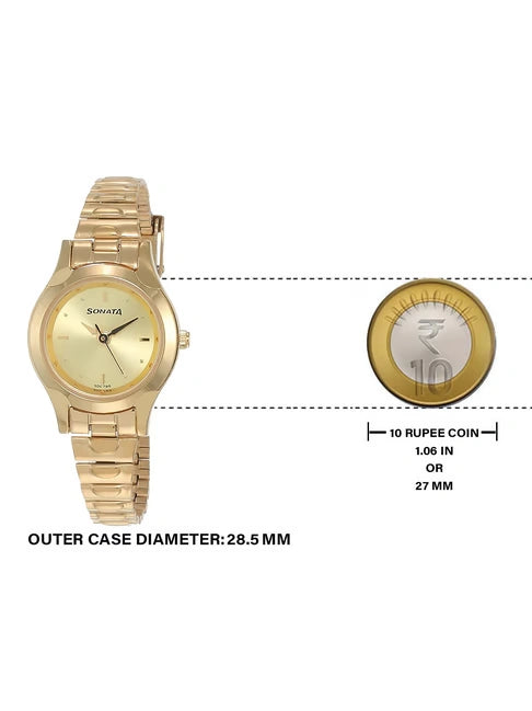 Get an elegant look by wearing this women's analog watch from Sonata. The golden round dial features plain three hands and a crown for time adjustment and is nestled in a 28.5 mm case. The stainless steel bracelet exudes a golden hue for an enhanced look. Moreover, the hook buckle clasp ensures a secured fit on the wrist.