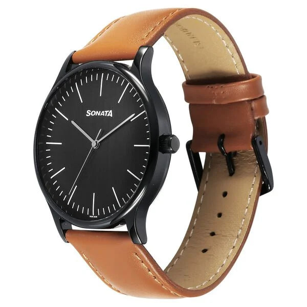 Sonata Aspire Quartz Analog Black Dial Leather Strap Watch For Men 77105nl15w