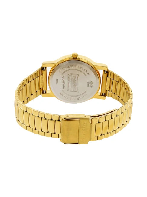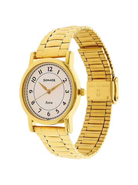 A perfect pick for every watch lover, this men's analog watch from the Astra collection by Sonata blends functionality with modern-day style. Its stainless steel bracelet comes in a golden hue that elevates the look of the watch. Housed in a 32.7 mm case, the white round dial looks quite attractive. It showcases plain three hands and a crown for time adjustment. Moreover, it is fitted with a hook buckle clasp that ensures a secure fit on the wrist.