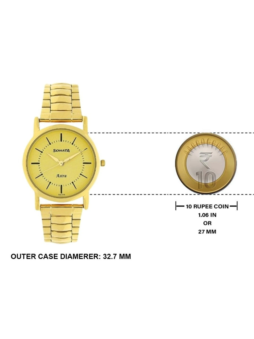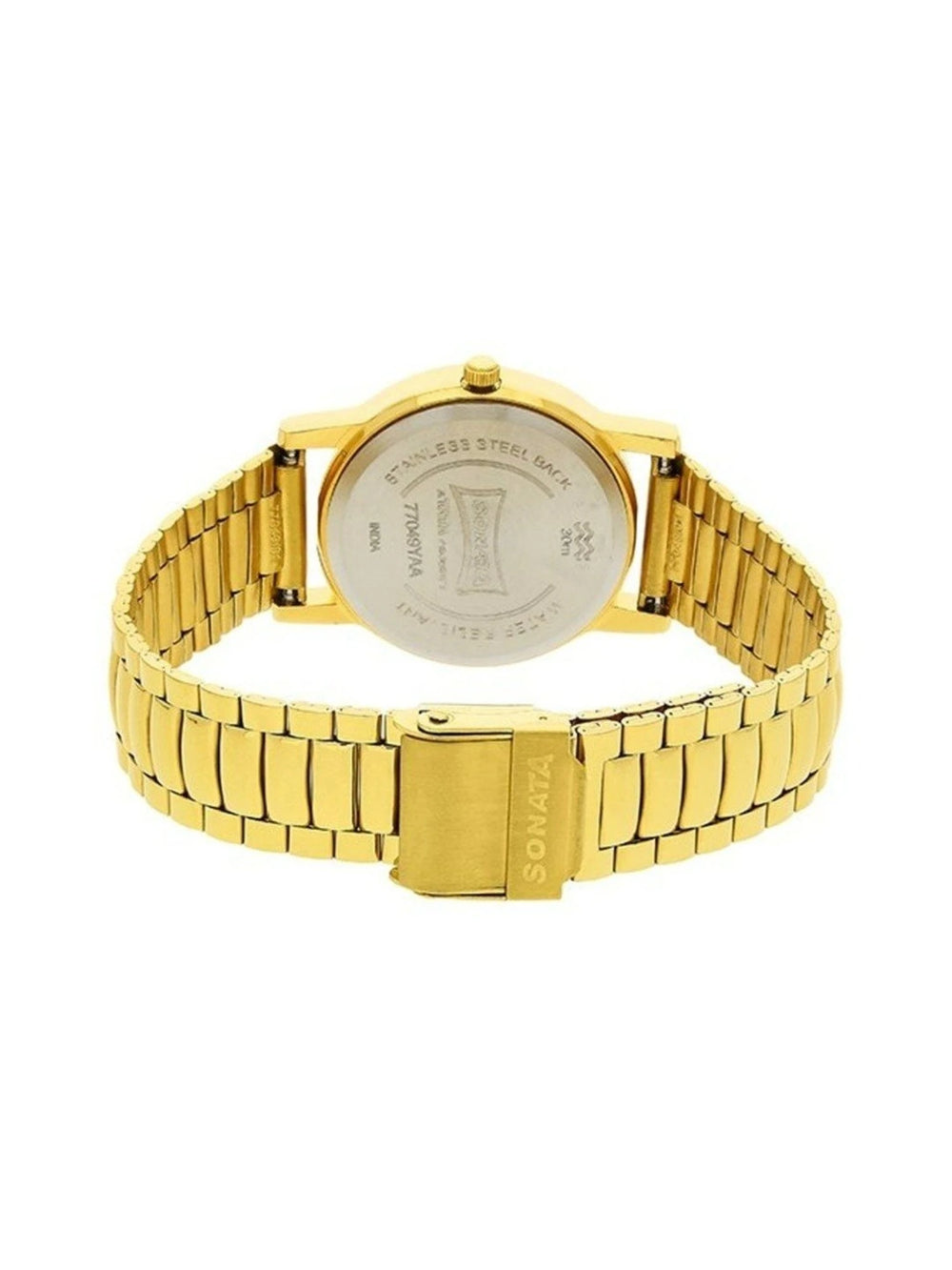 Sporting the right amount of soberness, this men's analog watch from Sonata's Astra collection is a must-have wrist essential. Safeguarded by a mineral glass, the champagne gold round dial runs on quartz movement and exhibits plain three hands that facilitates time reading. Crafted from premium quality stainless steel, the strap exudes a sparkling shade of gold that lends this timepiece a rich look. To ensure your wrist a proper fit, it comes with a hook buckle clasp. Team it with a pair of trousers and a shirt to look dapper.