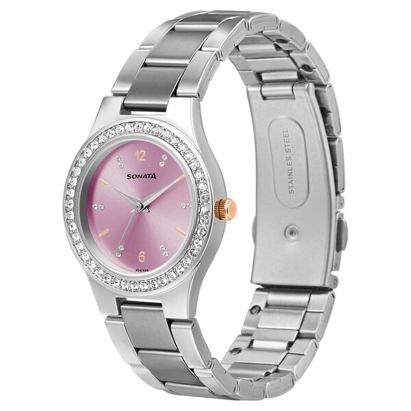Get a feminine look by sporting this women's analog watch from the Blush It Up collection from Sonata. The pink round dial features plain three hands and a crown for time adjustment and is protected by a 36.6 mm case. Its stainless steel bracelet exudes a silver hue for an attractive look. Moreover, its push-button clasp ensures a secured fit on the wrist.