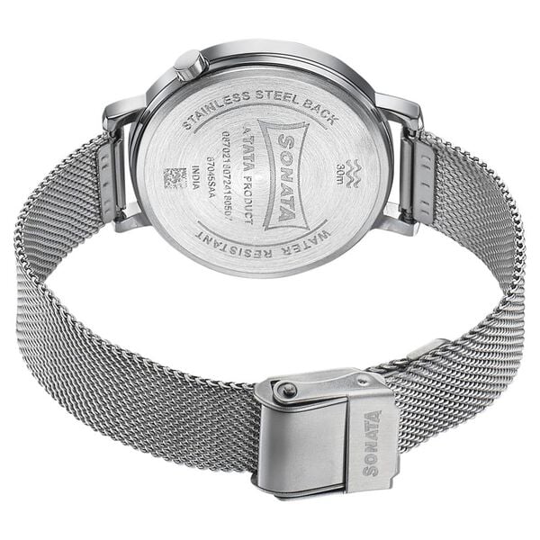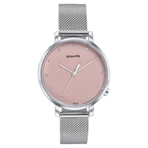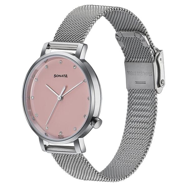 Complement your personality with this women's analog watch from the Elegant Essentials collection by Sonata. Enclosed in a 40 mm case, the pink round dial is secured by a mineral glass. It displays plain three hands. The stainless steel strap showcases a silver hue that uplifts the look of the watch. Besides, it is finished with a hook buckle clasp that provides a secure fit on the wrist.