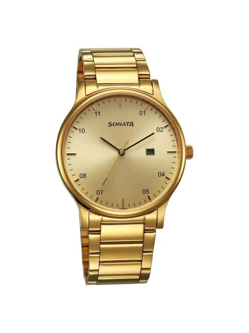 Elegance never goes out of style with this analog watch from Sonata. Encased in a 42 mm case, the gold round-shaped dial is covered with mineral-colorless watch glass and features plain 3-hand functionality for time adjustment. The watch works on a quartz movement. The stainless steel bracelet comes in a gold hue that further elevates the look of the watch. Besides, it is water resistant up to 30 m and is completed with a hook buckle to ensure a secure fit on the wrist.