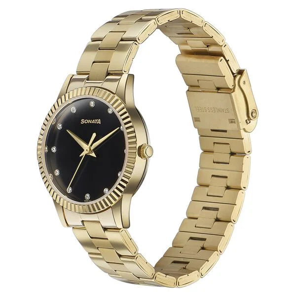 Sonata Glam Gold Quartz Analog Black Dial Stainless Steel Strap Watch For Women 87062ym01w