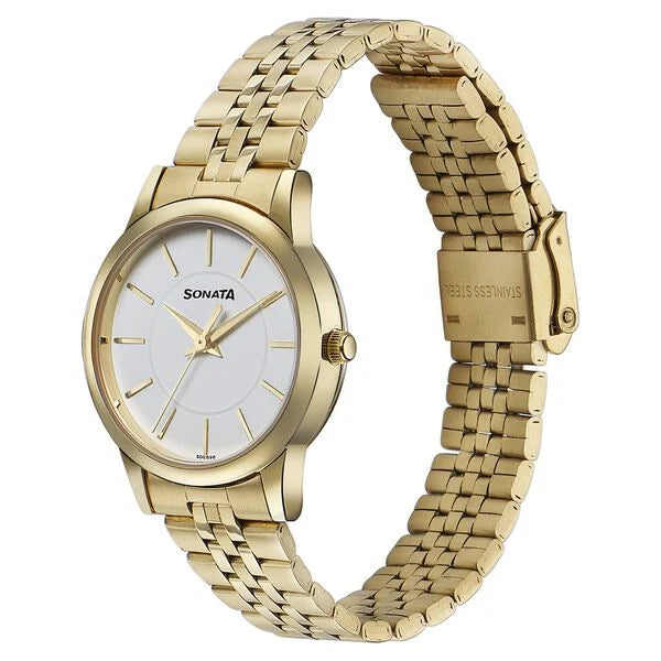 Sonata Glam Gold Quartz Analog White Dial Stainless Steel Strap Watch For Women 87061ym01w