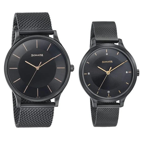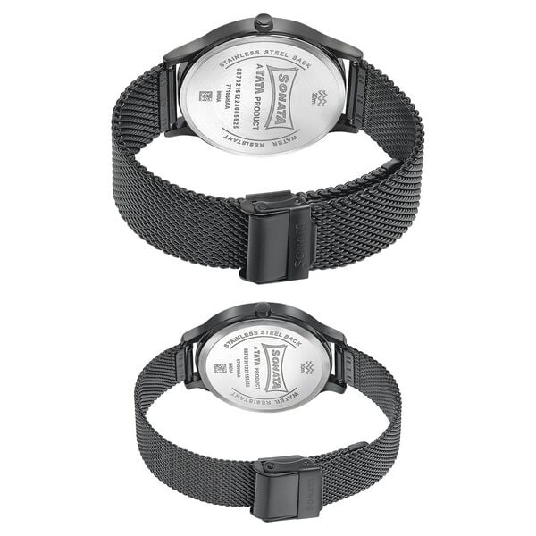 Sonata Modern Bandhan Quartz Analog Black Dial Stainless Steel Strap Watch for Couple - 7710587050NM02