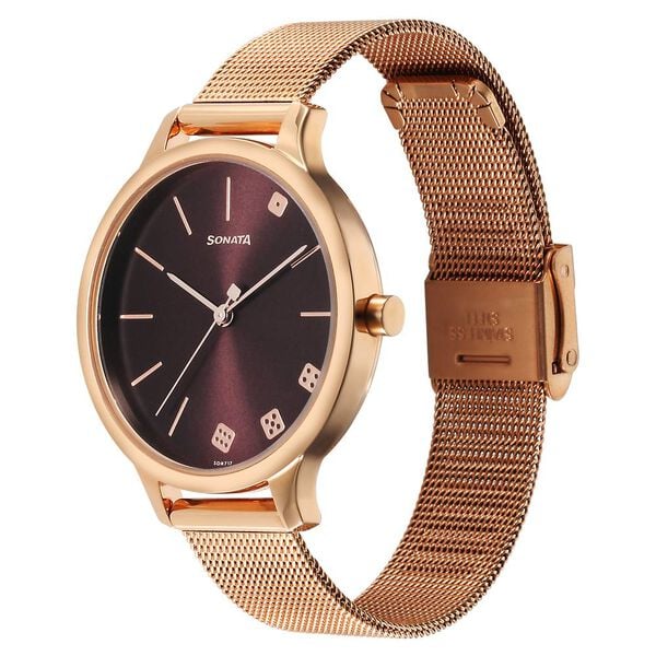 This stylish women's watch from Sonata features a vibrant Maroon dial paired with a sleek, metallic strap, blending fashion and functionality. Its minimalist design, quartz movement, and durable build make it a perfect accessory for daily wear or special occasions.