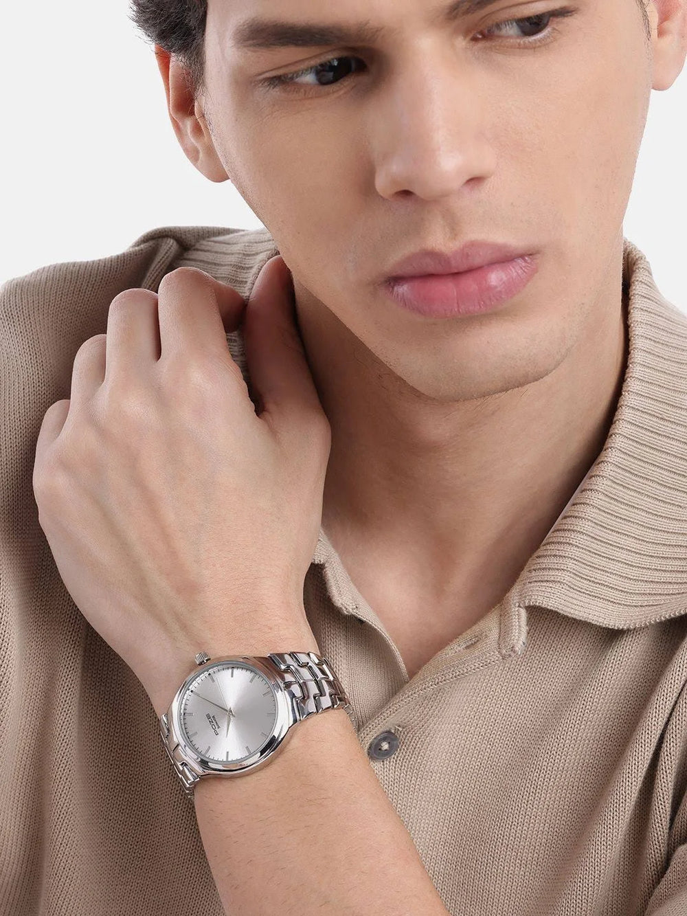 Designed to suit the preference of urban men, this watch from the collection by Sonata Poze is sure to make a style statement. Secured by a sapphire glass, the silver round dial is protected in a case. It exhibits crown for time adjustment. The metal strap flaunts a silver hue that accentuates the look of the watch. Moreover, it is fitted with a fold-over clasp with double push button safety clasp to ensure a secure fit on the wrist.