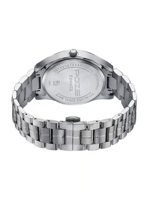 Designed to suit the preference of urban men, this watch from the collection by Sonata Poze is sure to make a style statement. Secured by a sapphire glass, the white round dial is protected in a case. It exhibits crown for time adjustment. The metal strap flaunts a silver hue that accentuates the look of the watch. Moreover, it is fitted with a fold-over clasp with double push button safety clasp to ensure a secure fit on the wrist.