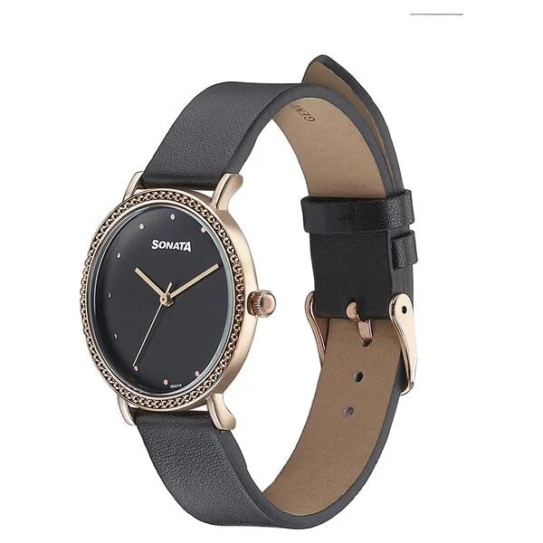 Sonata Quartz Analog Black Dial Black Leather Strap Watch For Women NT87066wl01