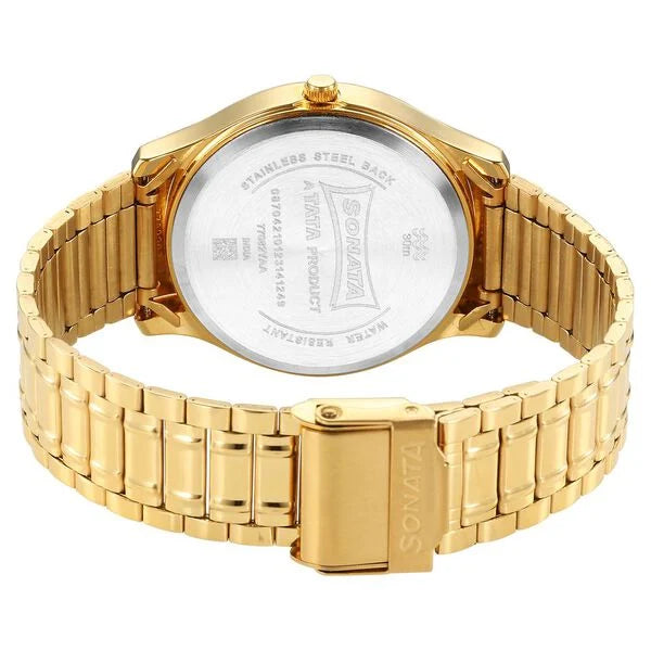 Amaze everyone around you by wearing this men's analog watch from Sonata. Encased in a 38 mm case, the blue round dial features plain 3-hand functionality and quartz movement on the watch. The stainless steel bracelet comes in a gold hue that further elevates the look of the watch. Besides, it is water resistant up to 30 m and is completed with a hook buckle to ensure a secure fit on the wrist.