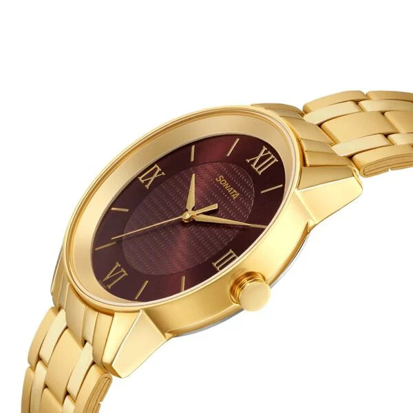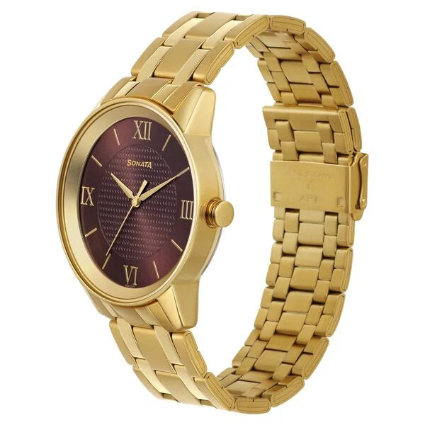 Take your look up several notches with this men's analog watch from the Utsav collection by Sonata. The brown round dial is nestled in a 47 mm case. It exhibits plain three hands and a crown for time adjustment. The stainless steel bracelet vaunts a golden hue that enhances the look of the watch. Furthermore, it is completed with a hook buckle clasp to ensure a secure fit on the wrist. This water-resistant watch will be your timeless possession.